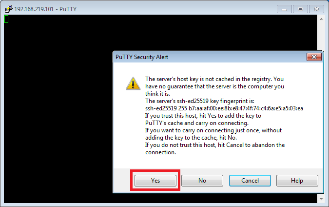 최초 접속시에는 아래처럼 보안 경고가 뜨게 되는데 "Yes"버튼을 클릭하여 PC에 접속 정보를 저장하도록 한다.