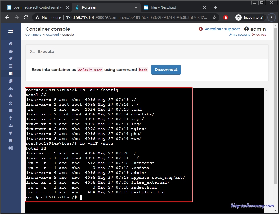 각 폴더의 용도를 살펴보면, "/config" 폴더는 NextCloud 실행을 위한 웹서버 및 php 소스 코드 등이 저장되어 있으며, "/data" 폴더는 사용자별 설정값 및 파일 저장 영역으로 사용되고 있음을 확인할 수 있다.