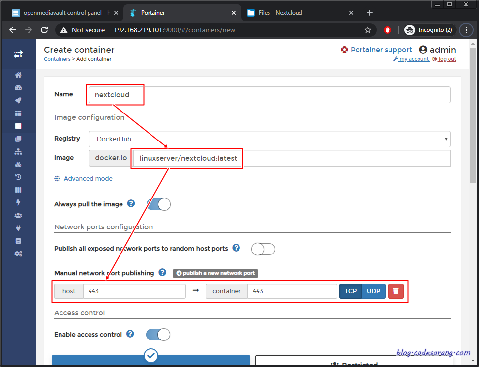 이제 컨테이너를 생성할 차례이다. 컨테이너 이름, 이미지, 그리고 포워딩할 포트를 아래처럼 입력한다.
