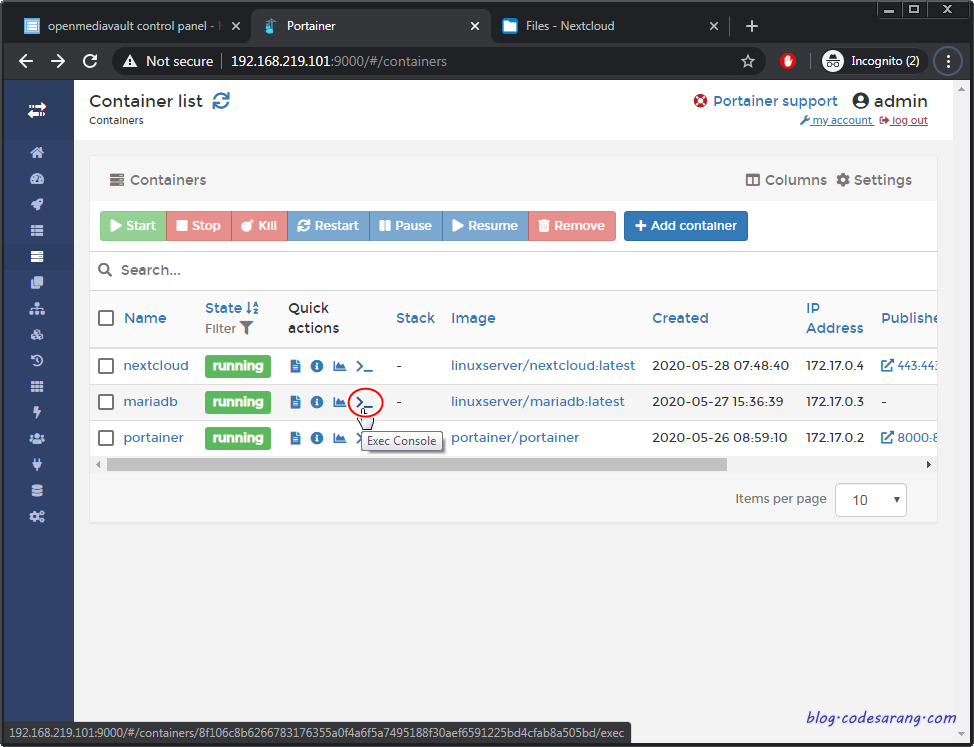 우선, NextCloud 컨테이너의 볼륨 용도 확인을 위해서 컨테이너 리스트에서 NextCloud 컨테이너를 클릭하도록 한다.