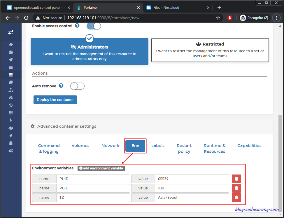 "Env" 탭으로 이동, "PUID", "PGID", "TZ" 값을 아래처럼 설정한다.