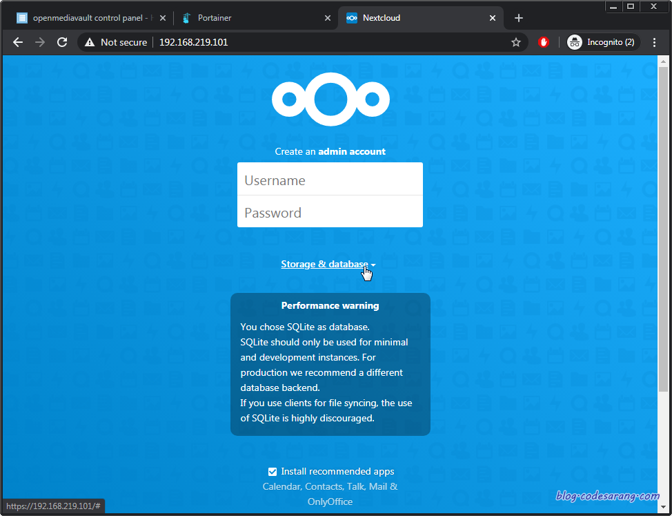 https로 라즈베리파이 IP주소로 접속하면 아래와 같은 초기 화면이 나온다. 관리자 ID 및 비밀번호, 그리고 db 접속정보 설정을 하도록 한다. 설정 방법은 https://blog.codesarang.com/28를 참고하자.