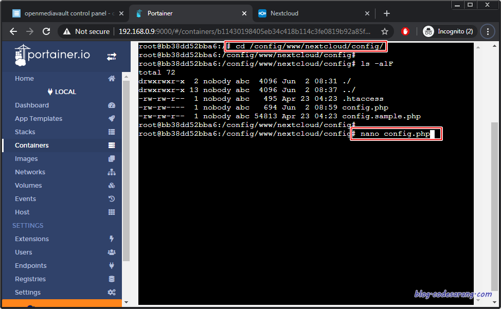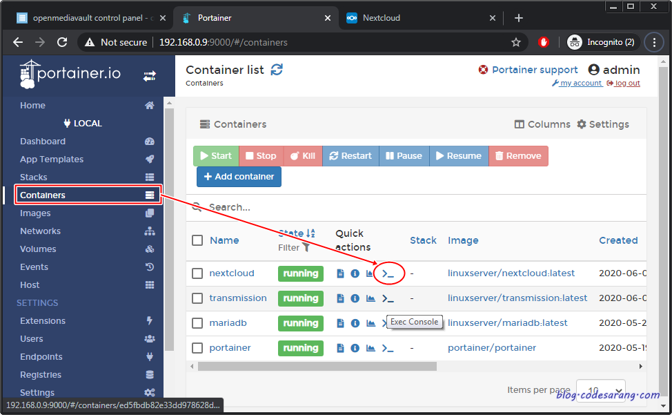 이를 위해서 Portainer로 접속, NextCloud 컨테이너의 콘솔로 접속한다.