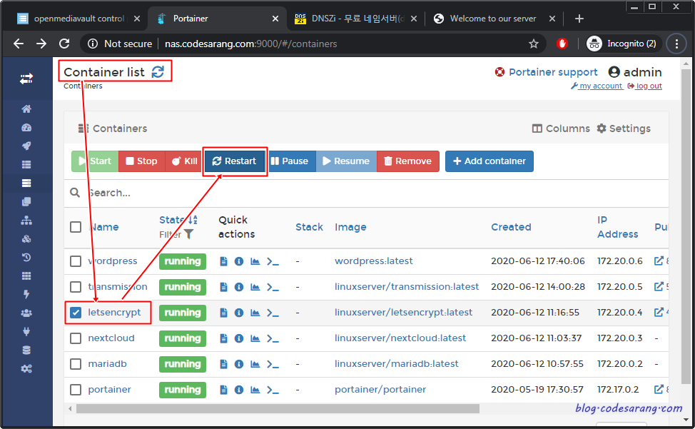 저장을 완료 하였으면, 다시 컨테이너 리스트로 가서 LetsEncrypt 컨테이너를 재시작 하도록 한다.