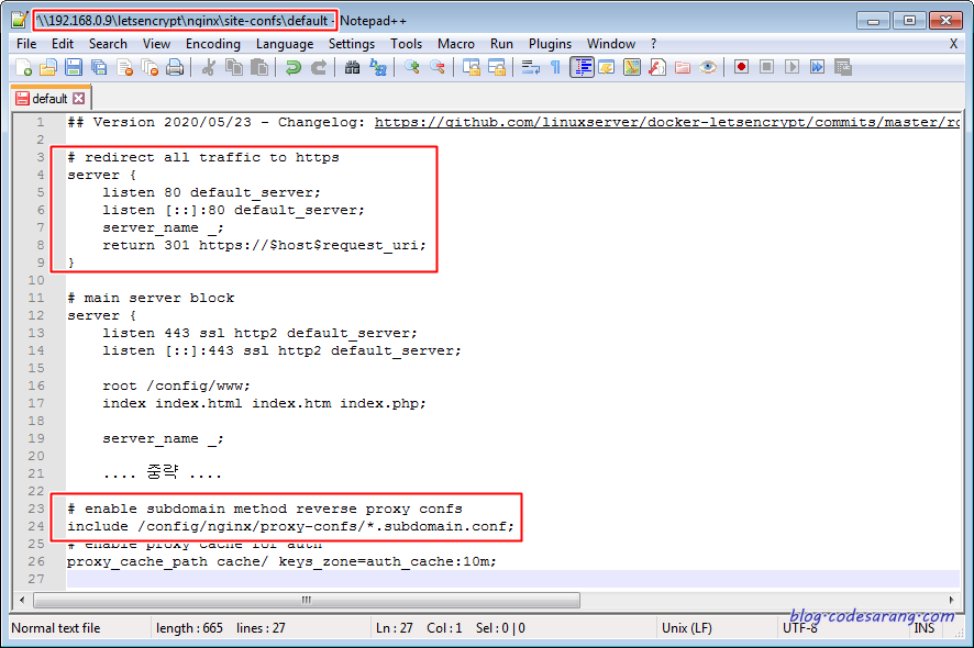 아래는 "site-confs" 폴더 아래 저장된 "default" 파일이다. 위쪽 설정을 살펴보면 80포트(http)로 접속할 경우 모두 https로 강제 리다이렉트 하도록 설정되어 있다.