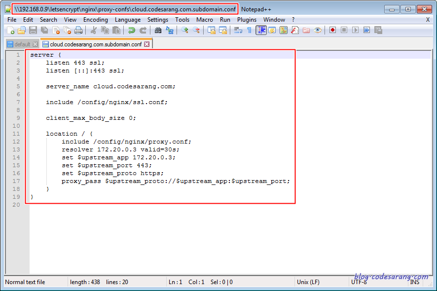 이제, "proxy-confs" 폴더에 아래 그림과 같은 파일을 생성하여 저장하도록 한다. 여러 샘플 파일(*.subdomain.conf.sample) 중에 아무거나 골라 아래 그림처럼 수정해 주면 된다. 여기서는 cloud.codesarang.com.subdomain.conf 로 저장하기는 했으나 다른 파일명이어도 상관 없다. 단지 확장자가 "subdomain.conf"로 끝나도록 저장해 줘야 적용이 되니 주의하도록 한다.