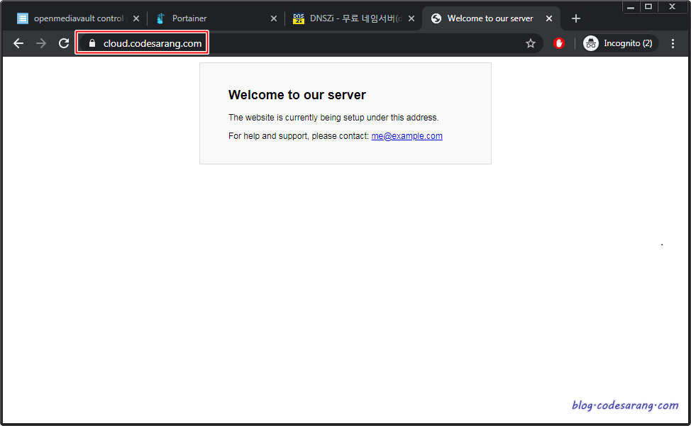 도메인 등록이 완료된 후 특정 도메인(여기서는 cloud.~~~.com)으로 접속하면 아래처럼 LetsEncrypt 컨테이너에 설정된 디폴트 웹 페이지로 접속된다.