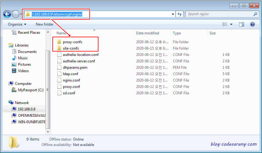 만일 https://blog.codesarang.com/33에서 설명한 것처럼 LetsEncrypt 컨테이너를 설정해 줬다면, 아래처럼 윈도우즈 탐색기를 이용하여 LetsEncrypt 설정 폴더에 접근할 수 있을 것이다.