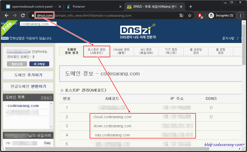 이제, 자신이 보유하고 있는 도메인 관리 페이지에 접속하여 아래처럼 A레코드를 추가하도록 한다. 예를 들어 NextCloud 접속을 위한 cloud.~~~.com이라든지, Transmission 접속을 위한 down.~~~.com과 같이 말이다.