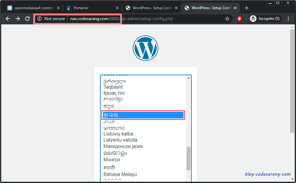 앞에서 워드프레스 컨테이너 설치를 하면서 워드프레스의 접속 포트를 8888로 매핑한 사실을 기억할 것이다. http://OMV-IP주소:8888 로 접속하면 아래와 같은 초기 설치 화면이 나온다.