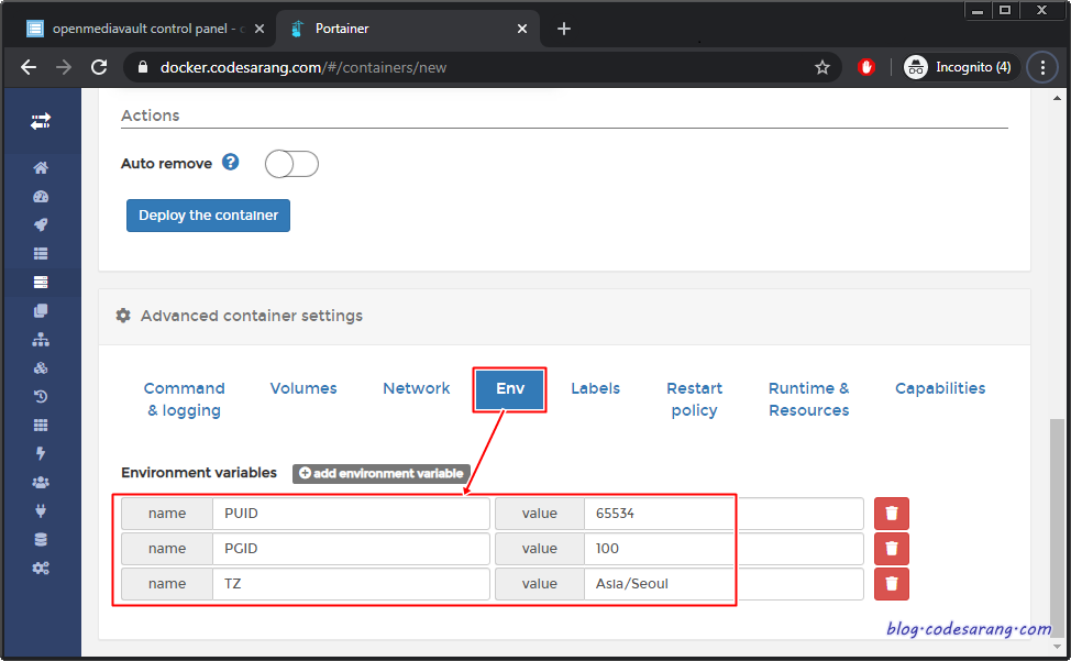 "Env" 탭을 선택, 아래처럼 PUID, PGID, TZ 변수와 해당되는 값을 입력해 준다.