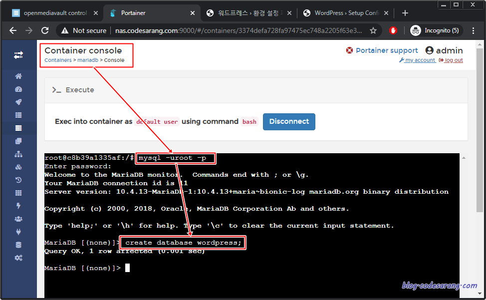 이제 마지막으로 mariadb 콘솔로 접속해 wordpress가 사용할 DB를 생성해 주도록 한다.