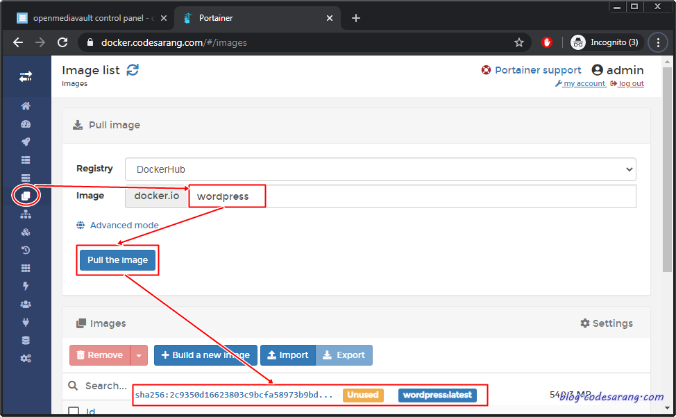 OMV5에서 Portainer로 접속한 후 "Images" 메뉴를 클릭, wordpress 최신 버전의 이미지를 확보한다.