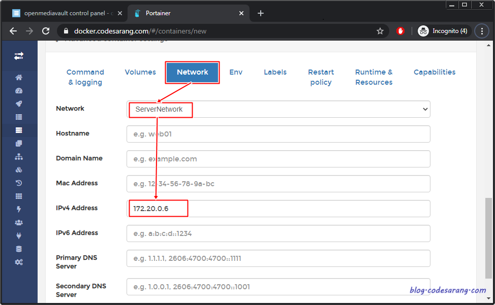 이제 "Network" 탭을 선택, "ServerNetwork"를 선택하고 빈 IP주소 하나를 할당한다. 혹시 "ServerNetwork"가 없는 사람은 아래 포스팅을 참고하도록 한다.