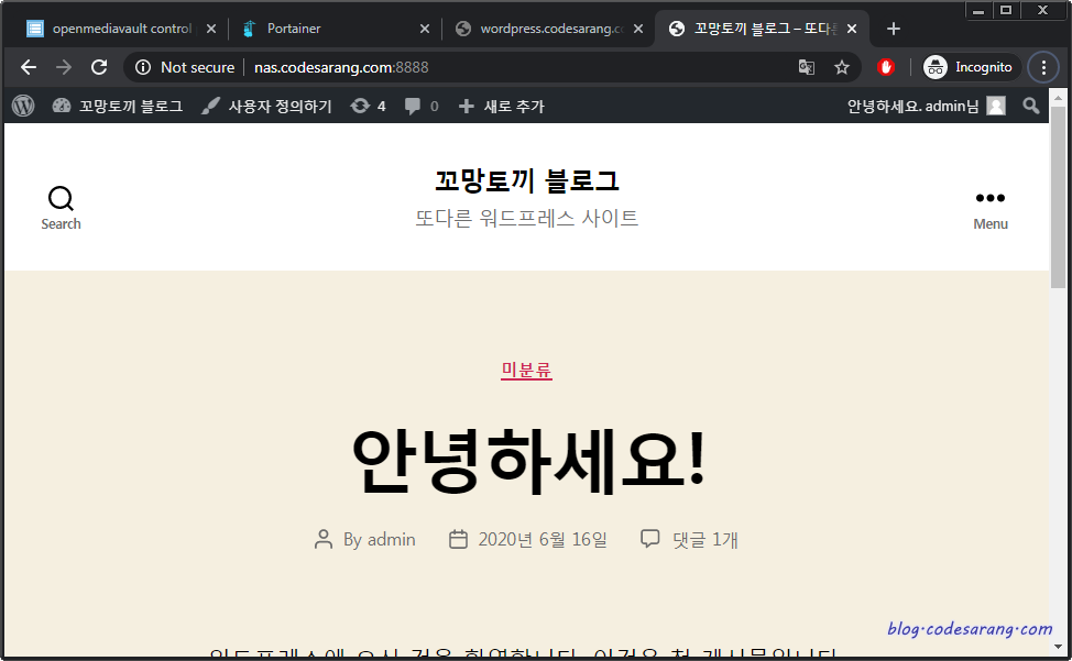 "꼬망토끼 블로그" 버튼 클릭 혹은 http://IP주소:8888 접속시 워드프레스 블로그 첫 화면을 볼 수 있다.