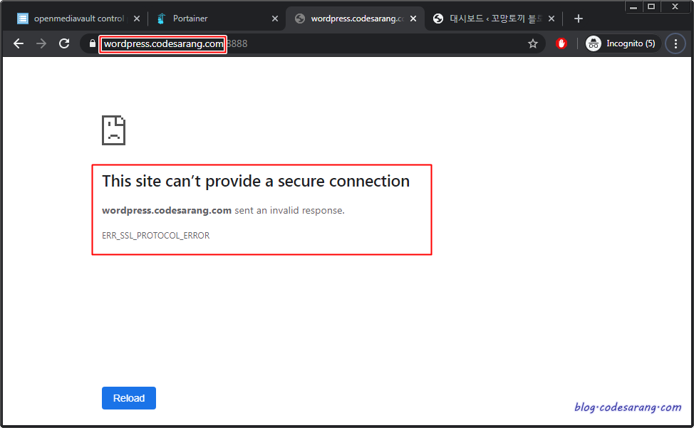 NginX Reverse Proxy 설정이 완료 되었으니 https로 접속해 보자. 아래처럼 https://wordpress.codesarang.com으로 접속할 경우 https://wordpress.codesarang.com:8888로 URL이 변경될 뿐만 아니라 이 사이트는 보안 접속을 제공하지 않는다는 오류 메시지를 표시해 버린다.