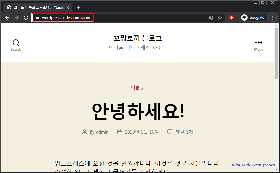 이제는 http://wordpress.codesarang.com:8888/로 접속하면 어떻게 될 것인가? https://wordpress.codesarang.com/로 알아서 이동해 준다.