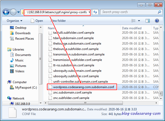 아래처럼 LetsEncrypt의 "proxy-confs" 폴더에 "wordpress.~~~.com.subdomain.conf"라는 파일을 생성한다.