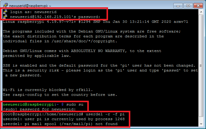 이제는 기존 사용자 "pi" 계정을 없앨 순서이다. "userdel" 명령을 이용하여 아래처럼 수행하면 라즈베리파이에서 "pi" 계정은 영원히 사라진다.