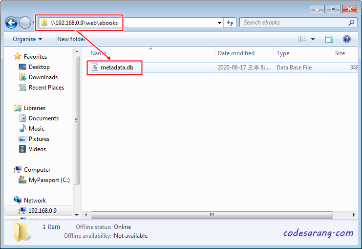 metadata.db 파일을 넣어주는 방법에는 두 가지가 있다. 단순하게는 빈 DB 파일을 컨테이너 "/books"에 바인딩해 놓은 SMB 폴더에 직접 넣어주는 것이다.