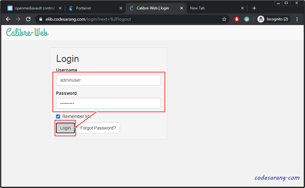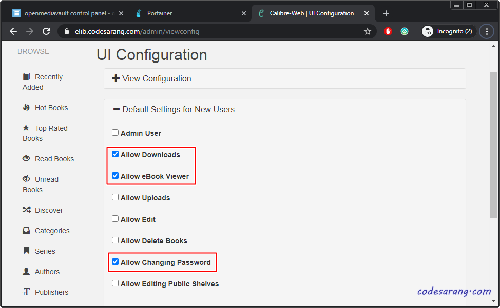 위의 작업을 거쳐 metadata.db 파일을 복사 혹은 생성하였다면 다시 캘리버 웹페이지에서 라이브러리 위치를 "/books"로 설정하고 "Save" 버튼을 누른다.