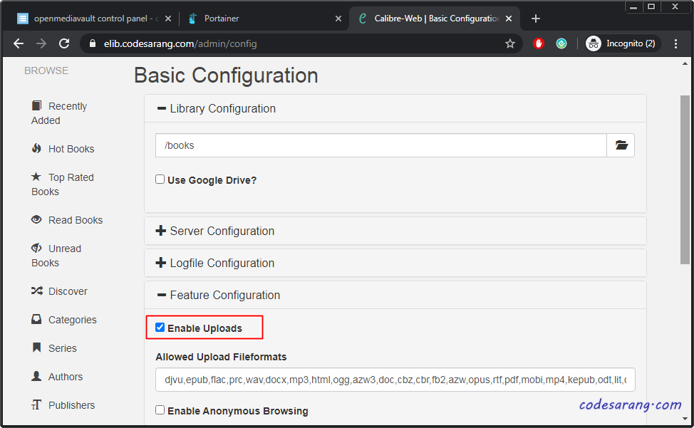 여기서 "Feature Configuration"의 "Enable Uploads" 체크박스를 체크해 주어야 전자책 업로드가 가능하다. 그리고 "Save" 버튼을 누른다.