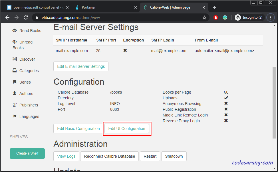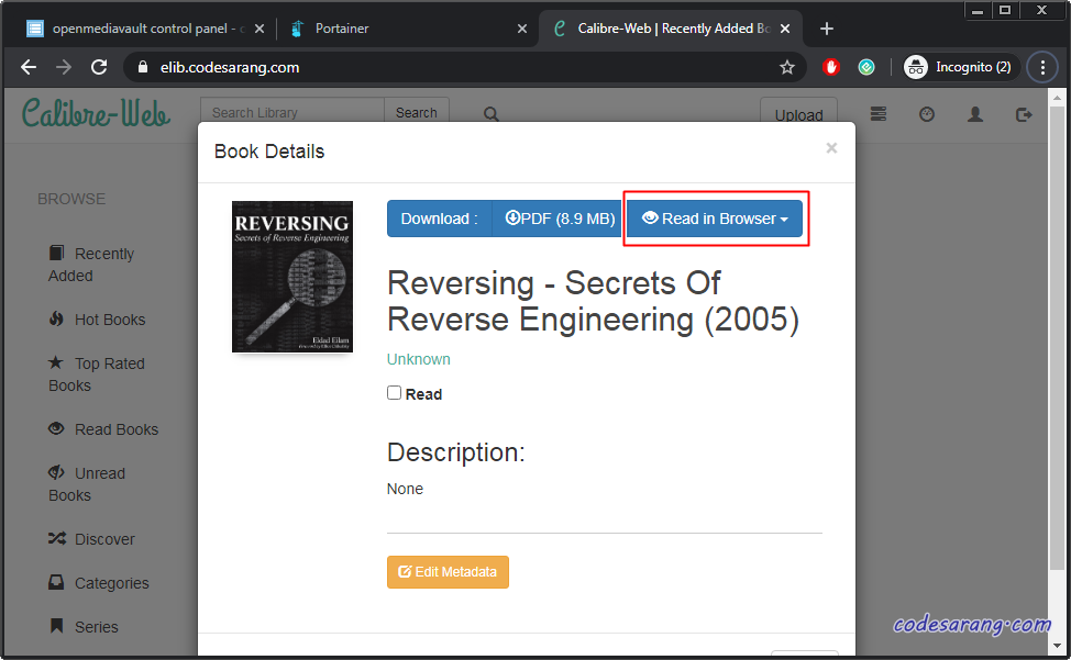 혹시 윈도우용 캘리버에서 전자책을 등록한 후 웹에서 바로 적용이 안될 경우 Admin메뉴에서 "Reconnect Calibre Database" 버튼을 눌러주면 정상 동작한다.
