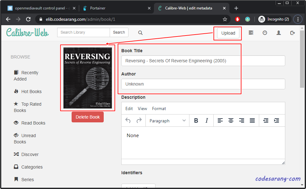 위에 환경설정이 정상적으로 완료되었다면 아래 그림처럼 우측 상단에 "Upload" 버튼이 활성화 된다. Upload 버튼을 클릭해 전자책(PDF, EPUB, MOBI 등) 파일을 업로드하면 자동으로 책 이미지와 제목이 입력된다.