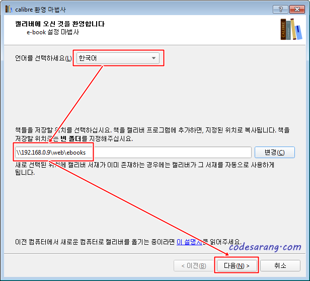 윈도우용 캘리버 프로그램을 설치한 후 최초 실행되는 환경설정 마법사에서 책들 저장 위치를 캘리버 웹의 저장소 위치를 지정한다.
