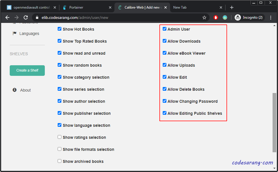 아래처럼 전자책 다운로드, 보기, 비밀번호 변경 등 일반 사용자에게 디폴트로 허용해줄 부분을 체크해 준다. 물론, 일반 사용자 생성시 아래 옵션은 변경 가능하다.