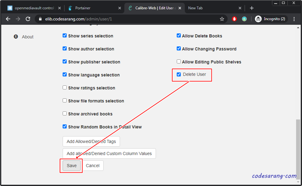 다시 Admin메뉴에서 "admin" 사용자를 클릭하고 아래로 스크롤하면 아래 그림처럼 "Delete User" 체크박스가 있다. 여기를 체크하고 "Save" 버튼을 클릭한다.