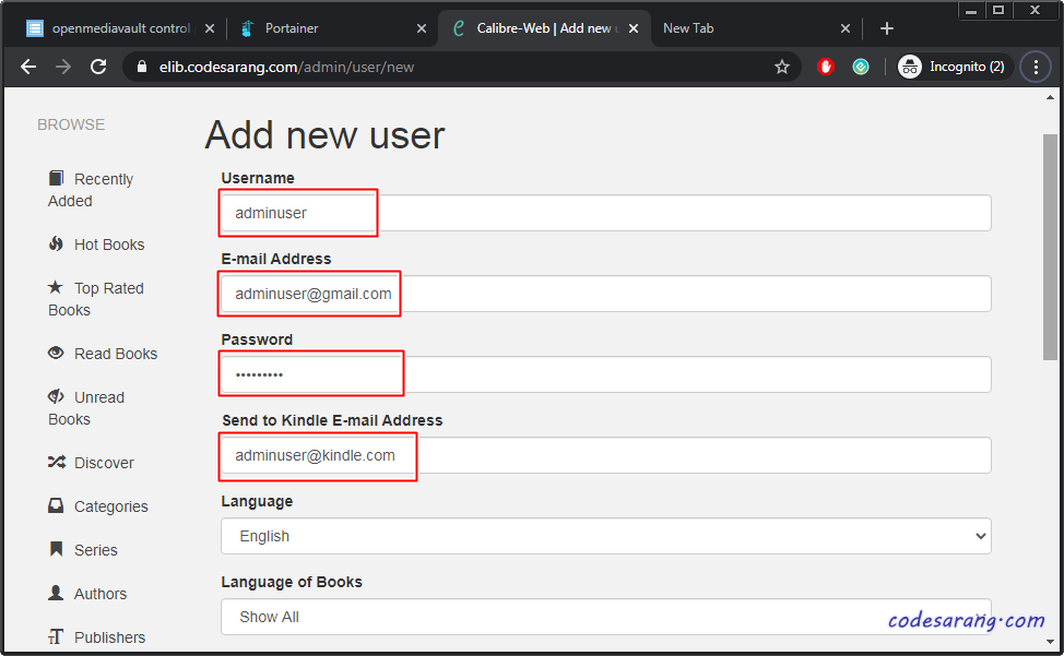Username, Email, Password 등을 입력한다. 아래 Send to Kindle E-mail Address의 경우 전자책을 본인의 킨들로 직접 보낼때 필요한 부분이나, SMTP 설정이 추가적으로 필요하다. 나중에 기회가 된다면 별도로 설명하도록 하겠다.