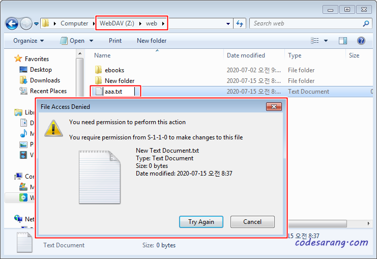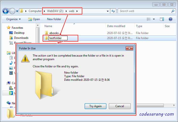 WebDAV로 마운트한 Z 드라이브에 폴더를 생성하고 폴더명을 변경해 보았다. 이 경우, 해당 폴더가 다른 프로그램에 의해 사용되고 있다는 에러와 함께 폴더명 변경을 실패한다.