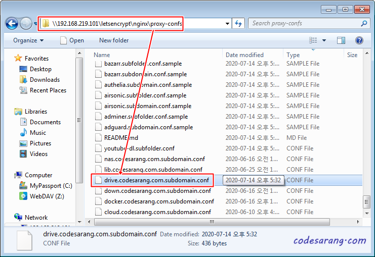 다시 그 설정 파일을 찾아보자. LetsEncrypt의 proxy-confs 폴더 아래에 drive.codesarang.com.subdomain.conf 파일로 만들어져 있다.