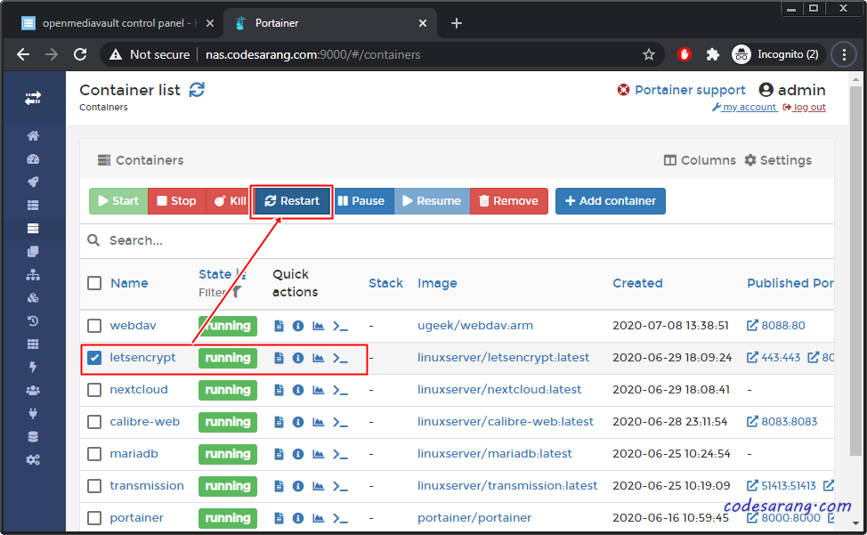 이제 LetsEncrypt 컨테이너를 재시작 하도록 한다.
