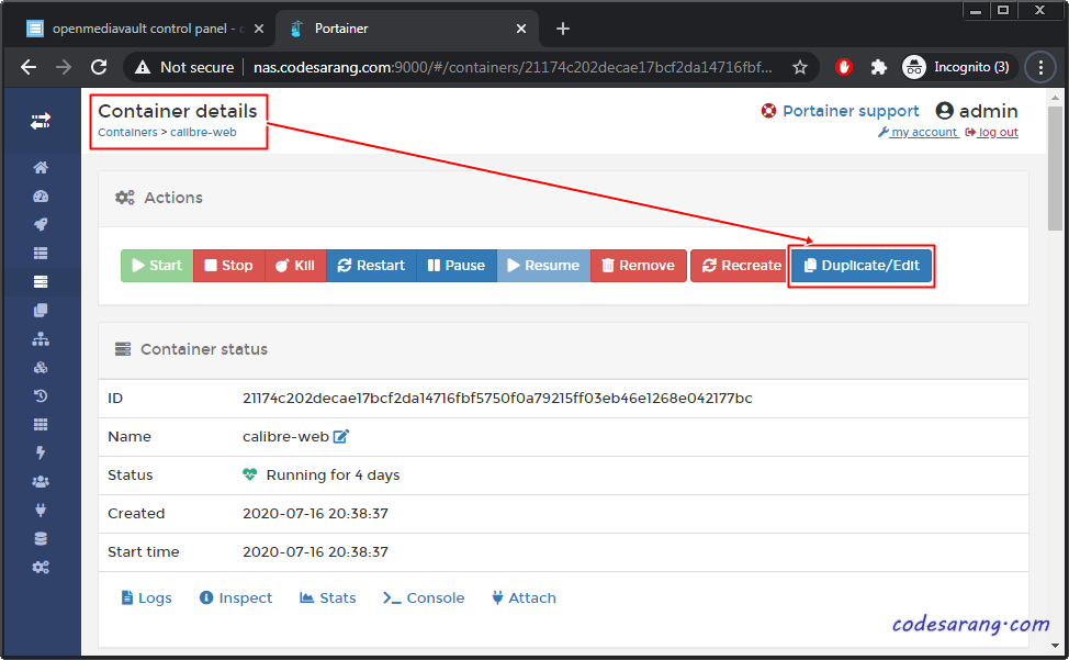 다시 캘리버 컨테이너 상세 정보에서 "Duplicate/Edit" 버튼을 클릭한다.