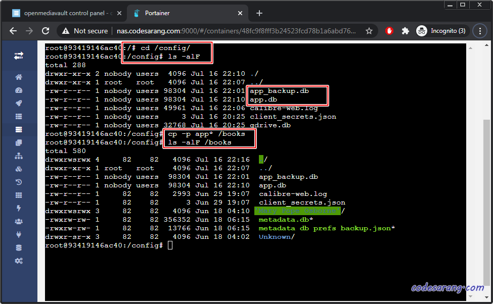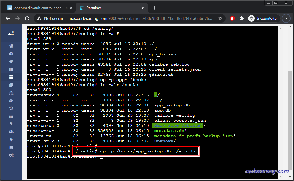 다시, 캘러버 컨테이너의 쉘로 돌아가 "cp -p /books/app_backup.db /config/app.db" 명령어를 이용하여 app_backup.db 파일을 app.db파일로 복사하도록 한다.