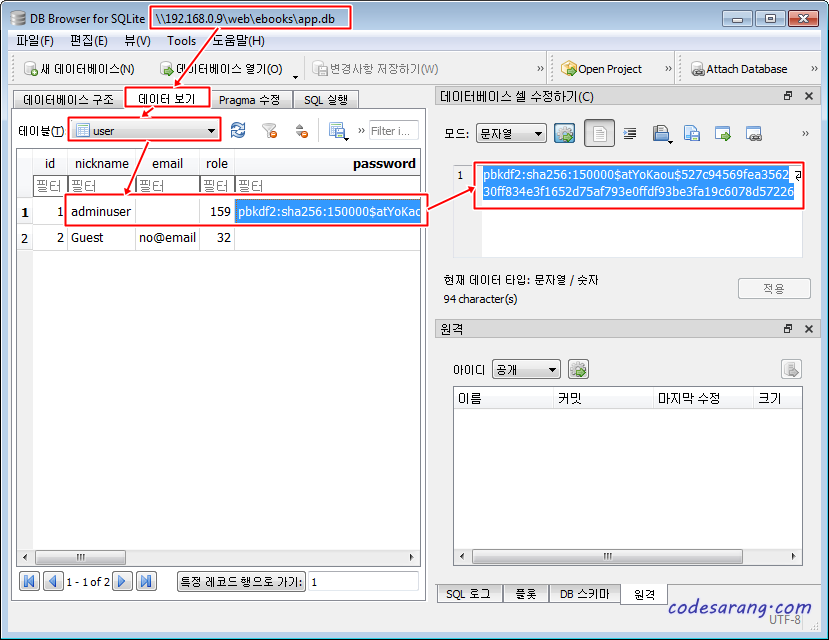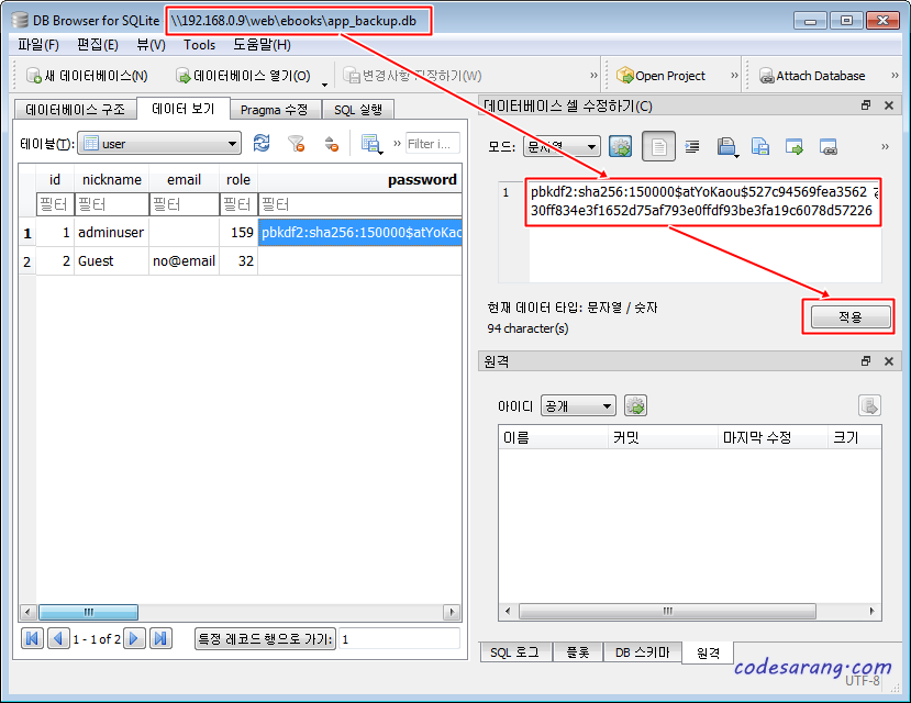 이제 app_backup.db 파일을 열고, 위와 동일한 위치로 이동하여 복사해둔 비밀번호 해쉬값을 붙여 넣도록 한다. 그리고 "적용" 버튼을 클릭한다.