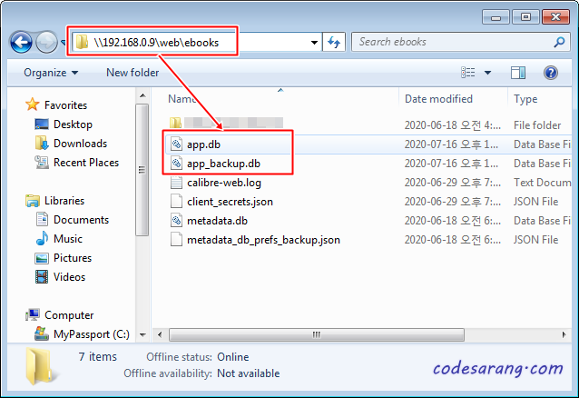 우선 아래 명령으로 app.db, app_backup.db 파일을 /books 폴더로 복사도록 한다. /books 폴더는 라즈베리파이의 외장 HDD로 마운트 되어 있어 윈도우PC에서 바로 접속 및 수정이 가능하다.