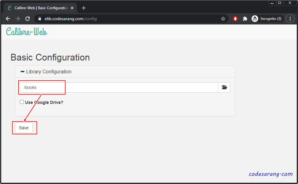 이제 캘리버에 다시 접속하면 아래처럼 Basic Configuration 화면이 나온다. Library Configuration에 "/books"를 입력하고 "Save" 버튼을 누른다.