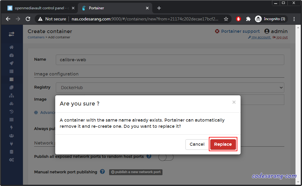 아래와 같은 경고 메시지가 나오면 "Replace" 버튼을 클릭한다.