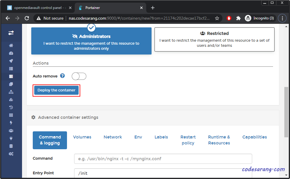그리고 아래쪽으로 스크롤하여 "Deploy the container" 버튼을 누른다.