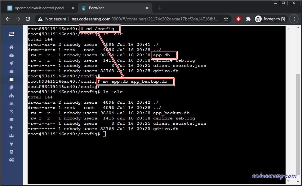 캘리버 컨테이너의 경우 "/config" 폴더 아래 app.db 파일에 사용자 ID 및 비밀번호 등이 저장되어 있다. 이를 초기화 하기 위해서는 Portainer를 실행, 컨테이너 리스트에서 캘리버 컨테이너의 쉘로 접속한다.