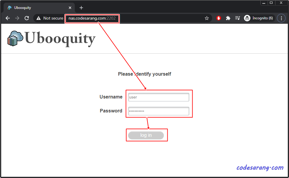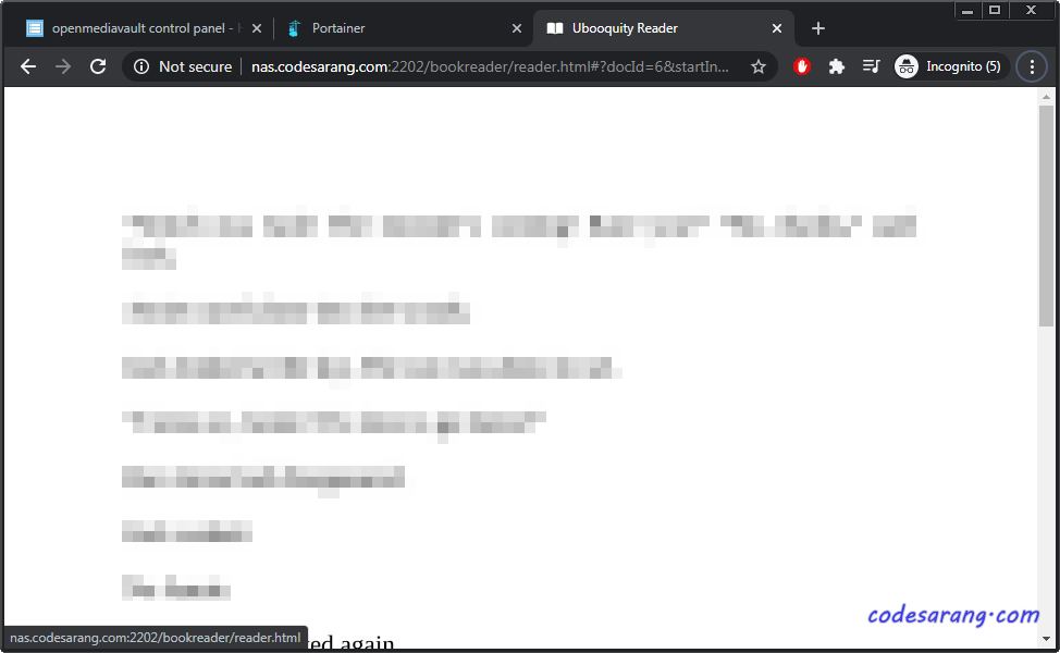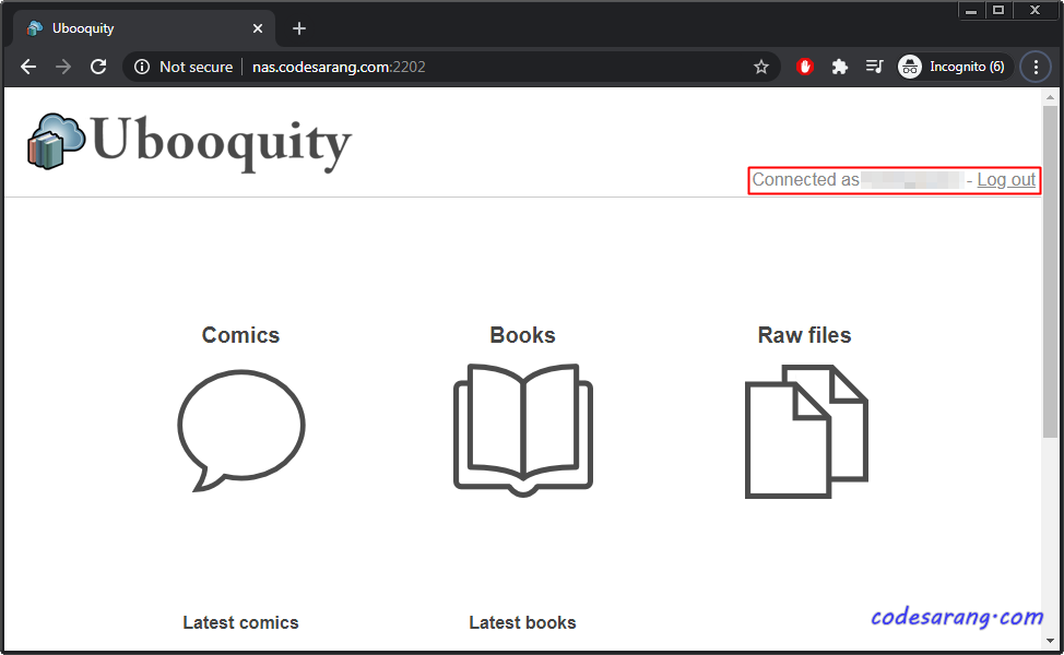 이제 http://nas.codesarang.com:2202/로 접속하면 ubooquity 접속이 가능하다. 위에서 추가한 사용자 ID 및 비밀번호로 로그인 하도록 한다.