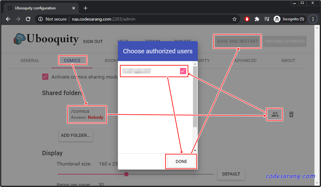 아래 그림에서 관리자 페이지 접속 URL이 http://nas.codesarang.com:2203/admin로 바뀐것을 볼 수 있다. 이제 "COMICS", "BOOKS", "RAW FILES" 탭을 각각 선택하면서 카테고리별 접근 허용할 사용자를 선택하고 설정을 저장 한다.