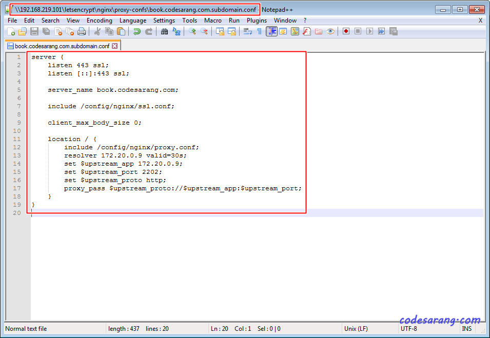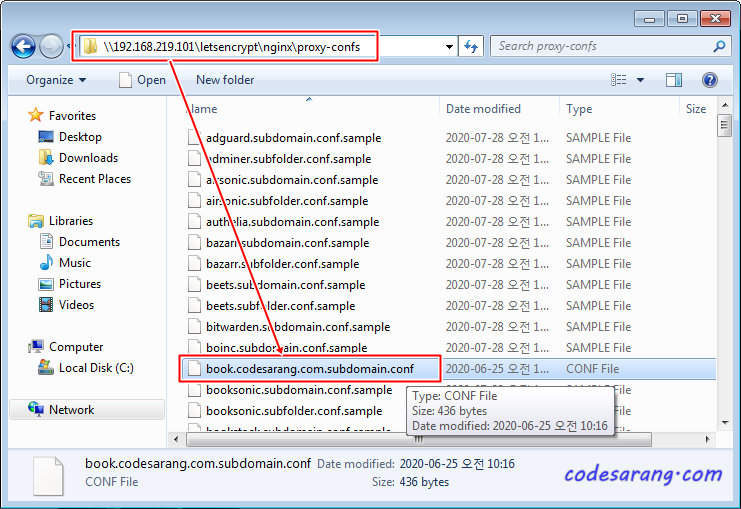 그리고, LetsEncrypt의 proxy-confs 폴더에 "book.codesarang.com.subdomain.conf" 파일을 생성한다.
