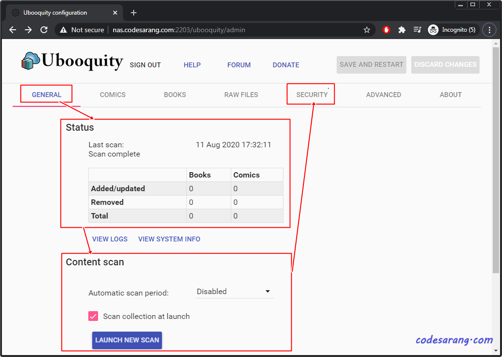 우선 ubooquity 관리자 페이지(나의 경우 http://nas.codesarang.com:2203/ubooquity/admin)로 로그인하면 아래와 같은 화면을 볼 수 있다. 여기서 "Status"는 등록된 전자책 현황을 볼수 있는 화면이고, "Content scan"은 전자책 폴더(/books 또는 /comics 등)에 전자책을 복사한 후 자동 또는 수동 스캔을 설정하는 부분이다.
