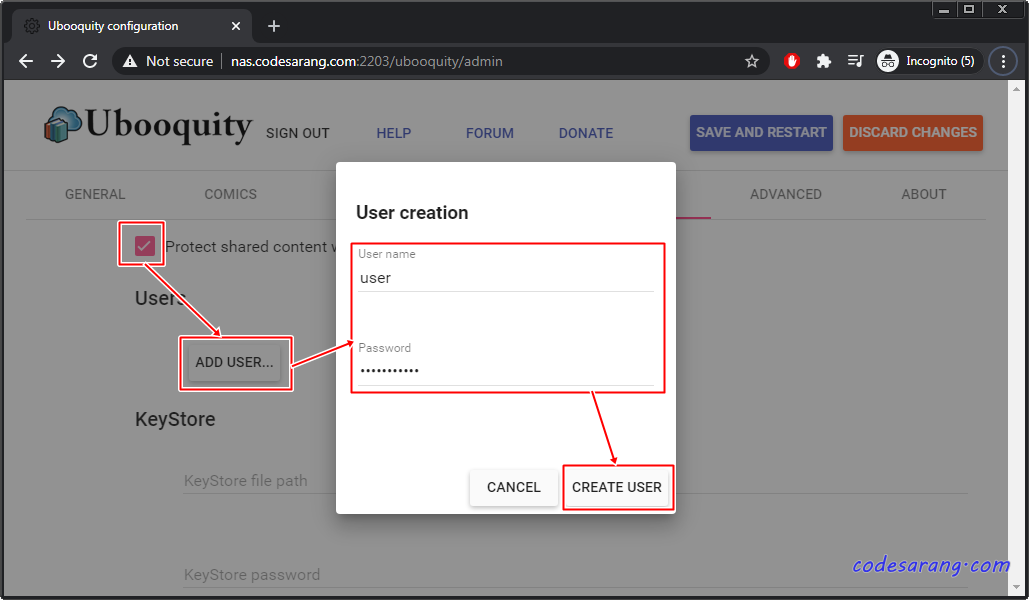 우선, "Protect shared content with user accounts" 체크박스를 체크한 후, "ADD USER..." 버튼을 눌러 새로운 사용자를 추가하도록 한다.