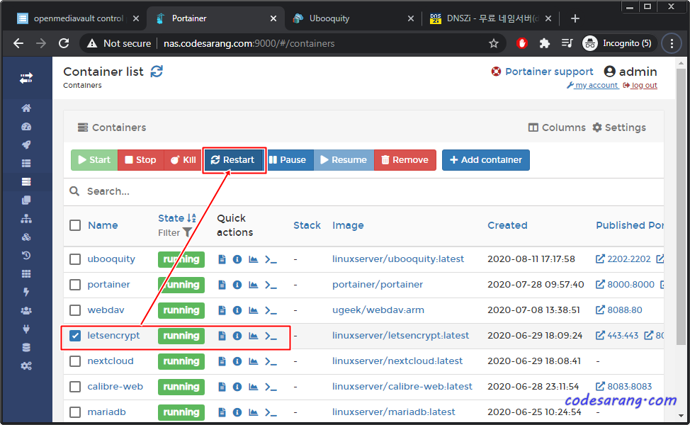 이제 LetsEncrypt 컨테이너를 재시작 하도록 한다.