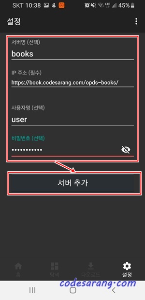 만약 만화책을 읽고 싶다면 위에서 처럼 만화책 새로 서버를 추가하여야 하며, 나의 경우 "https://book.codesarang.com/opds-comics/" 주소가 만화책용 OPDS 주소이다.